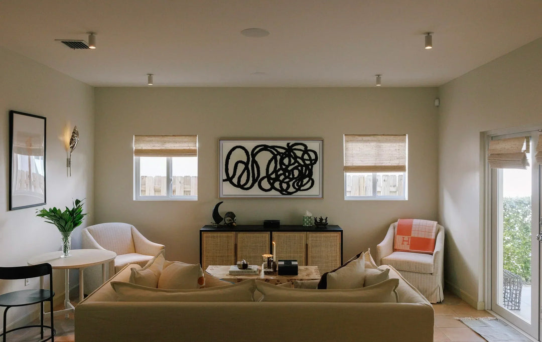 Lighting played a big role in shaping the home’s mood and rhythm. Throughout, Tala Core Recessed Spotlights were selected for their dimmable, overall ambient light, a thoughtful contrast to their name. Installed in a nontraditional grid with deliberate spacing, the fixtures provide both practical illumination that serves as task lighting and a diffused light for evening entertaining. The clean, understated lighting forms a calming backdrop for the home’s statement fixtures. The result is a fluid shift from bright and functional to soft and loungey.