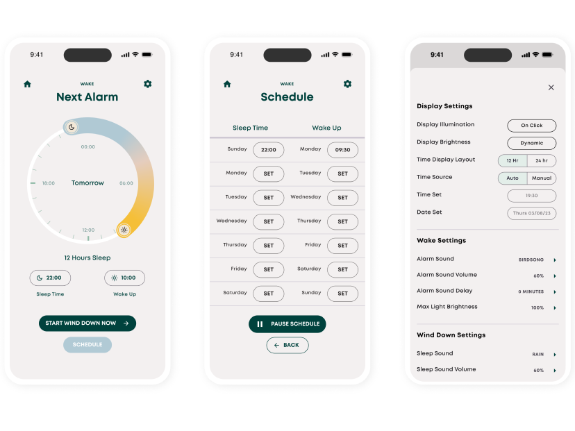 Schedule daily wake up and wind down times to promote regulated sleep patterns. Configure settings on the lamp body or in the Tala App.