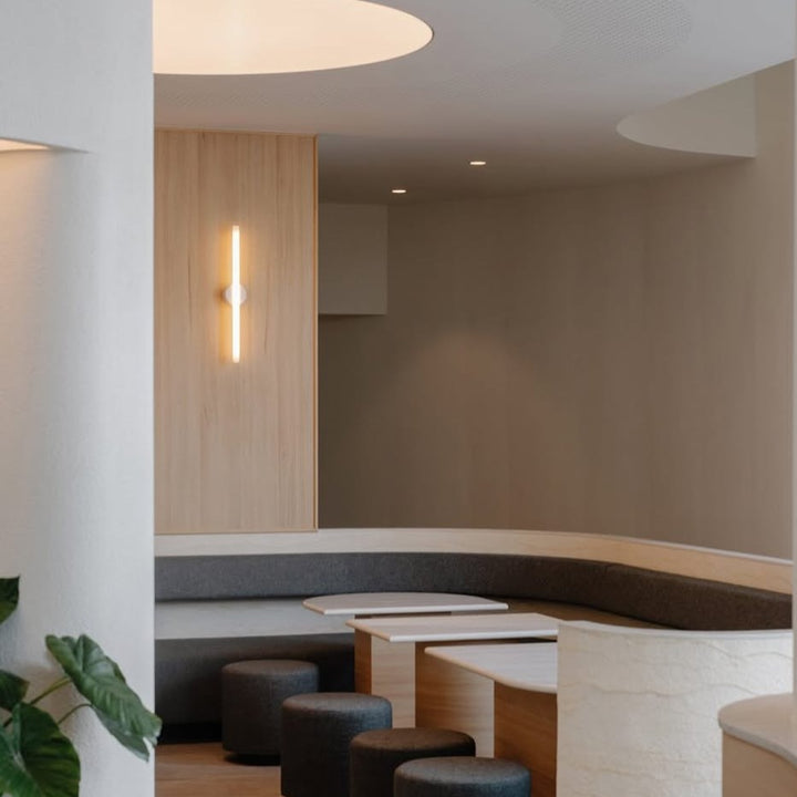 Named in reference to the delicate confluence of the linear light source and central pivoting fixture, the light frosted finish subtly exposes and celebrates the internal filament when illuminated while maintaining the form of a typical S14d light source.