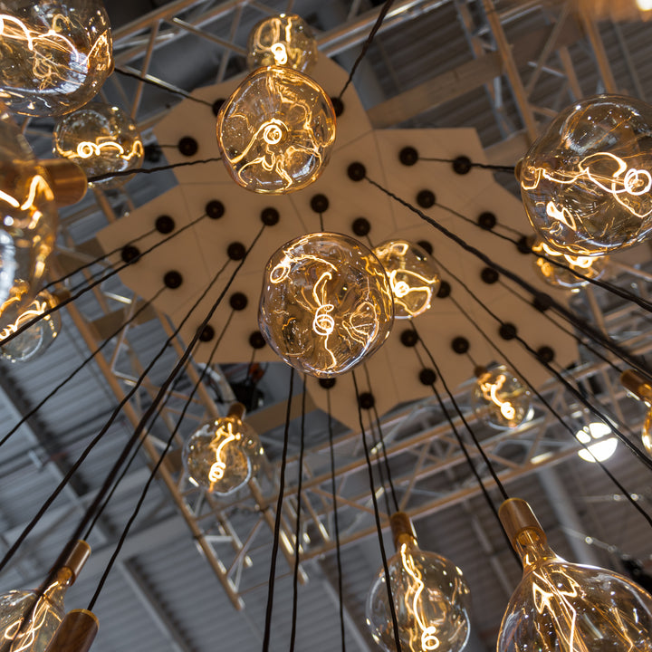 Voronoi bulbs are mouth-blown and shaped in a solid steel mould. The custom LED filament is hand assembled around the glass core, and the iron tint finish on the borosilicate glass helps create a soft and layered refraction of light.